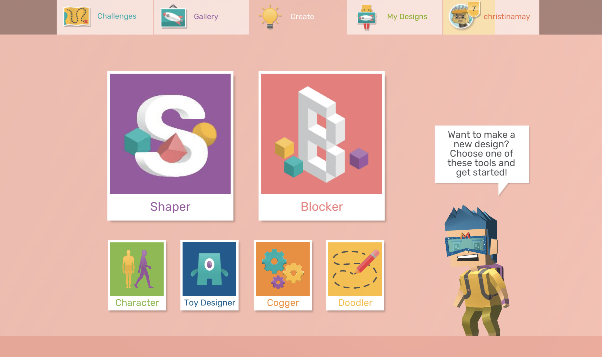 The new Create tab houses the six design modules: Shaper, Blocker, Character, Toy Designer, Cogger, and Doodler.