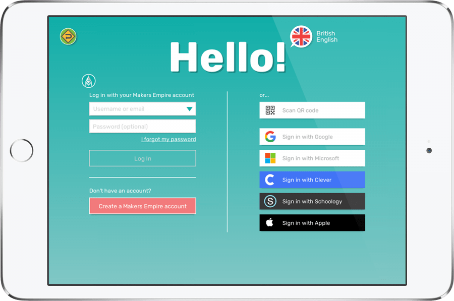 1. Have your students open the Makers Empire 3D app and click on the big green Log In button, and then log in using their Makers Empire account details, QR code, or one of the Single Sign On (SSO) options; Google, Microsoft, Schoology, Clever or Apple. (3 mins)